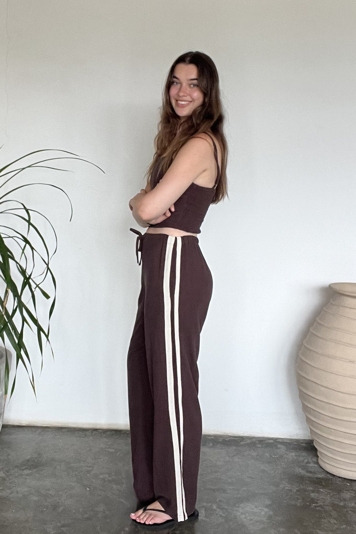The Avriel Pants in Espresso combine the luxurious feel of our signature linen rayon crepe fabric with thoughtful design details. Featuring a comfortable drawstring and elastic waist, they provide a tailored fit with ease. Natural-colored racing stripes add a fun accent, complementing the matching Marcy Top for a coordinated summer vibe.