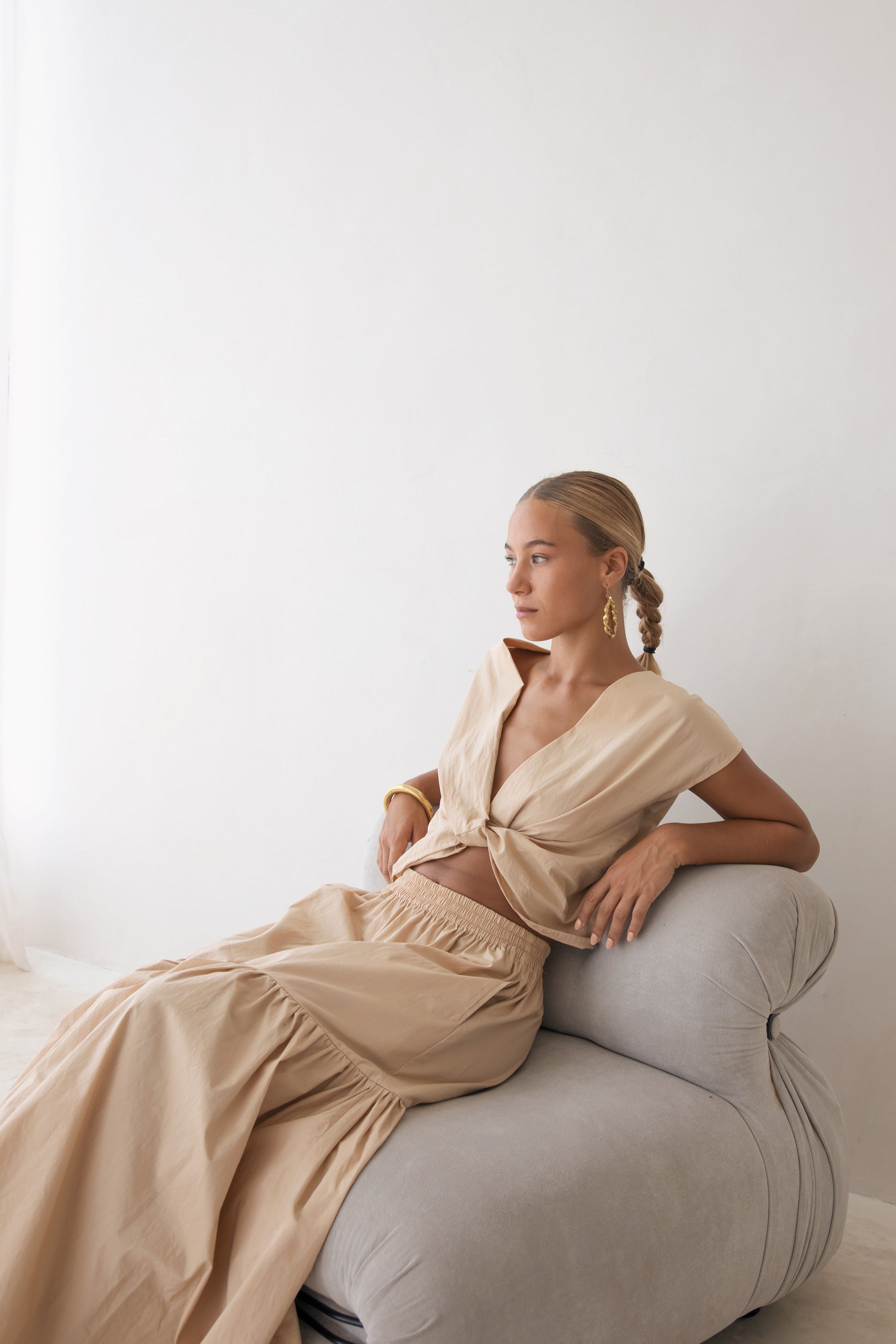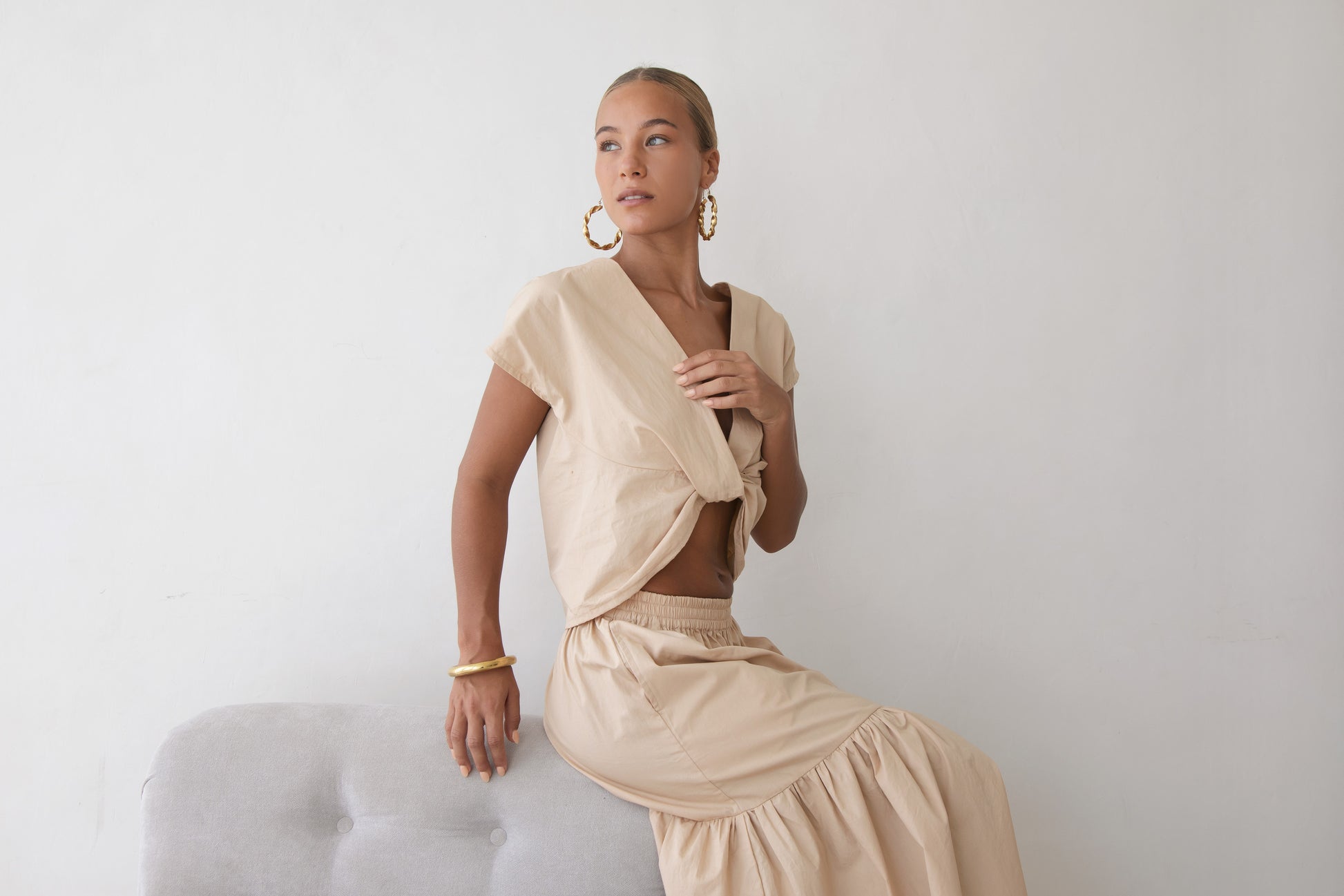 With the Mirella Top, you can choose to flaunt a sultry summer look with the deep V and knot detail at the front, or turn around and reveal the alluring deep V at the back. Two tops in one! Complete the set with the Greer Shorts or Tomika Skirt in Ecru for a coordinated outfit.
